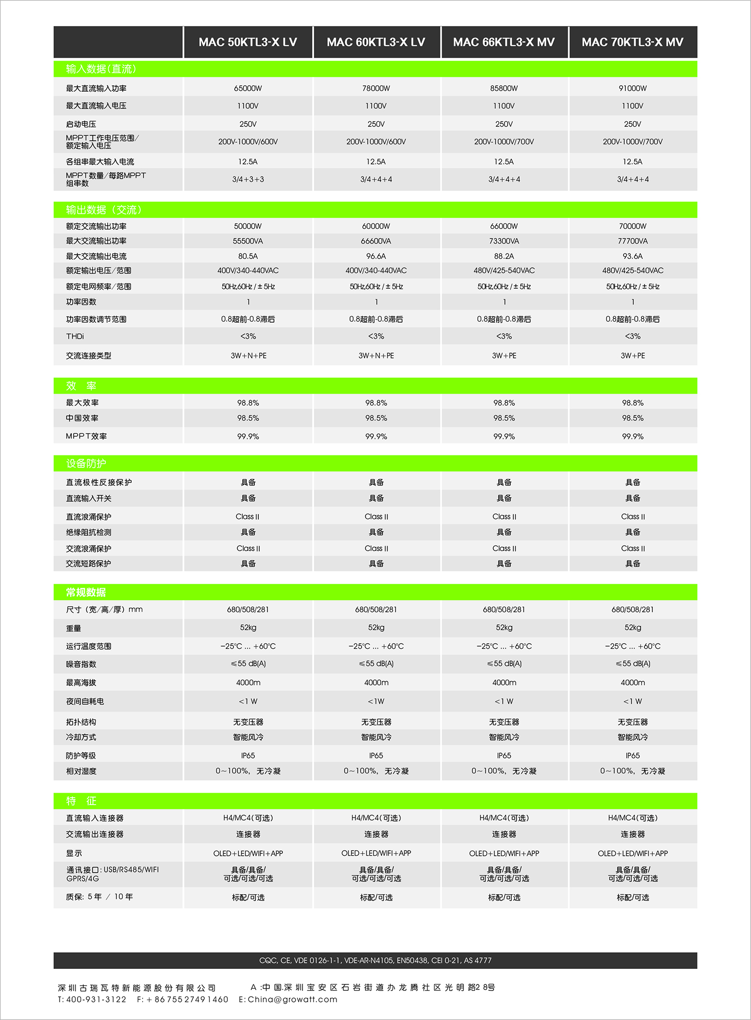 Hiệu suất chuyển đổi tối đa là 98,8%, hiệu suất của Trung Quốc là 98,5%, điện áp đầu vào DC tối đa là 1100V và thành phần hai mặt là MPPT 3 chiều. Màn hình OLED chống sét thông minh AC và DC làm mát bằng không khí thông minh và giám sát phím cảm ứng rất linh hoạt .