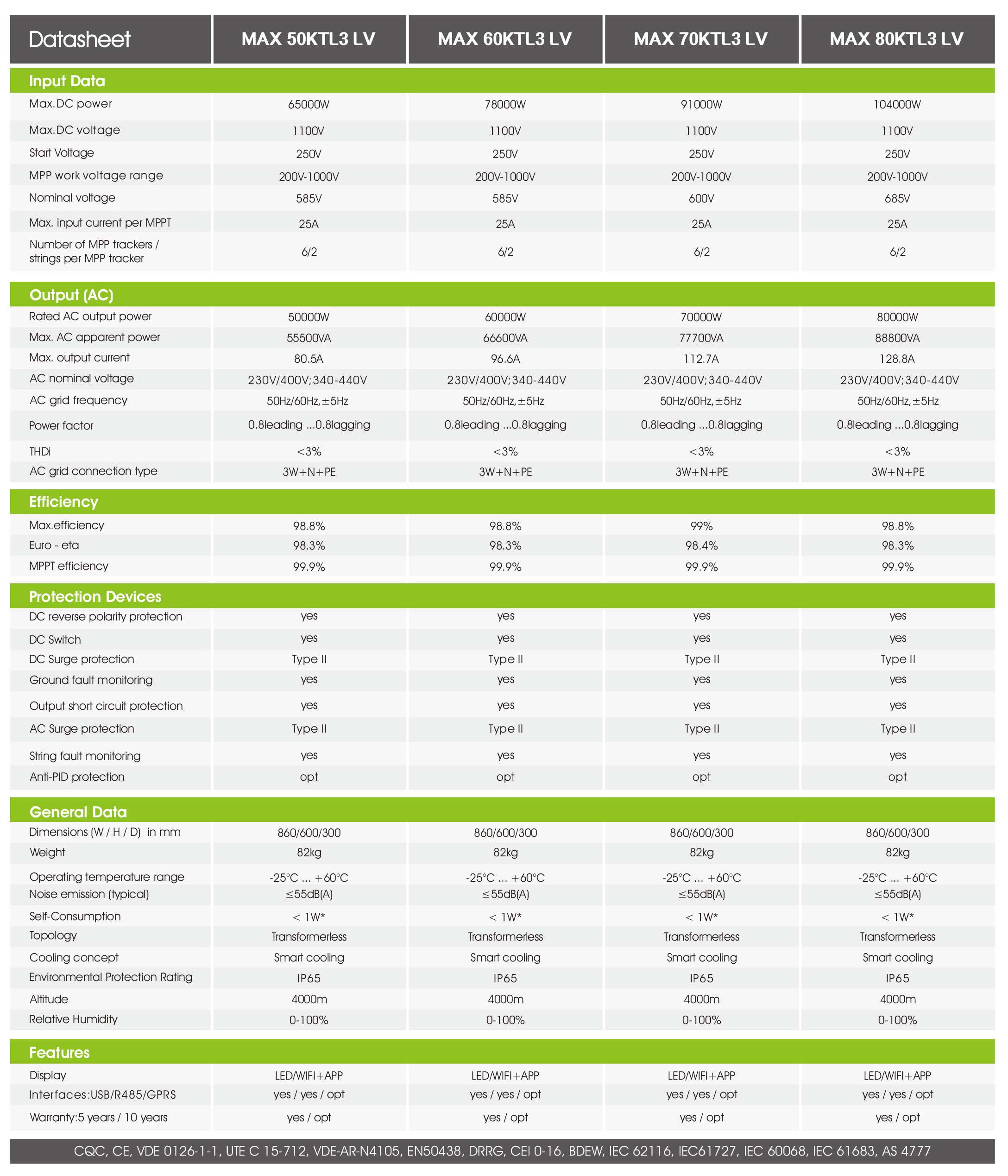 Hiệu suất chuyển đổi tối đa là 99%, hiệu suất của Trung Quốc là 98,6%, điện áp đầu vào tối đa là 1100V, quét đường cong I / V thông minh, chẩn đoán một phím và ghi sóng, bảo vệ chống sét thứ cấp AC và DC, mô-đun nguồn đầy đủ và thiết kế lõi tứ.